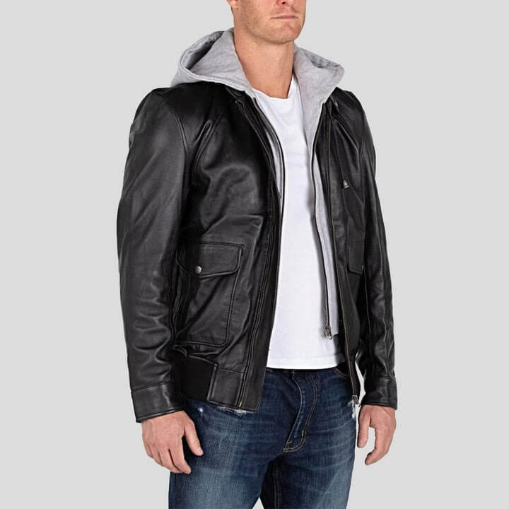 Upgrade your outerwear with the Marc Black Removable Hooded Leather Jacket. Crafted from high-quality black leather, this jacket features a sleek design with a removable hood for added versatility. The premium leather provides durability and a sophisticated appearance, while the removable hood allows you to adapt to changing weather conditions. Ideal for both casual and formal settings, this jacket combines style and functionality effortlessly. Enjoy the exceptional craftsmanship of Avanzar Leather with hassle-free shipping and easy returns. Transform your wardrobe with this versatile black hooded leather jacket.