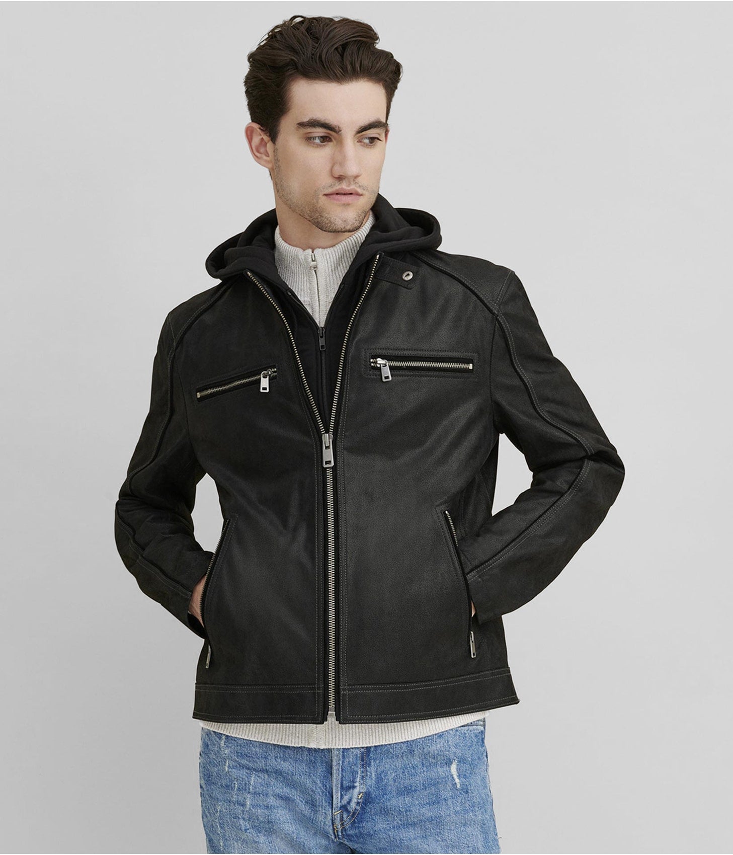 Discover the ultimate blend of sophistication and edge with the Men's Black Suede Leather Cafe Racer Jacket. This jacket features luxurious black suede leather, offering a refined look and soft feel. Designed with a classic cafe racer silhouette, it combines modern style with timeless charm. The high-quality suede ensures durability and comfort, making this cafe racer jacket a standout choice for both everyday wear and special occasions. Elevate your wardrobe with a piece that exudes elegance and rugged sophistication.
