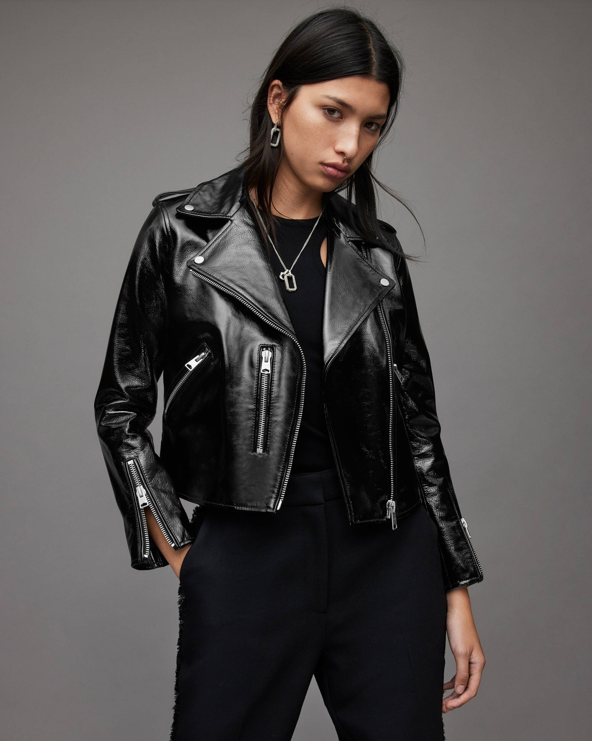 Women's Black Biker Leather Jacket with Shoulder Straps