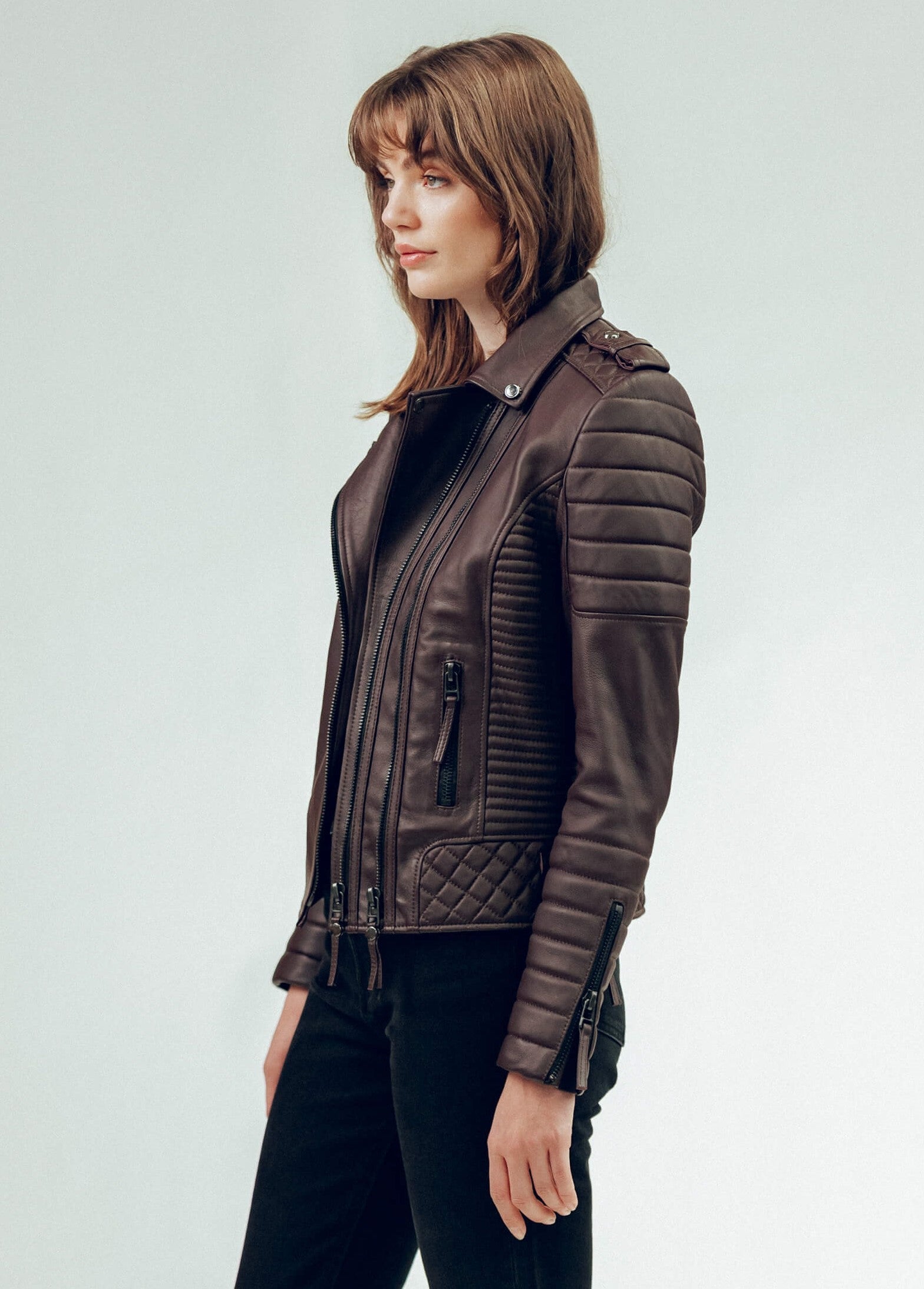 Women's Dark Brown Cafe Racer Leather Biker Jacket