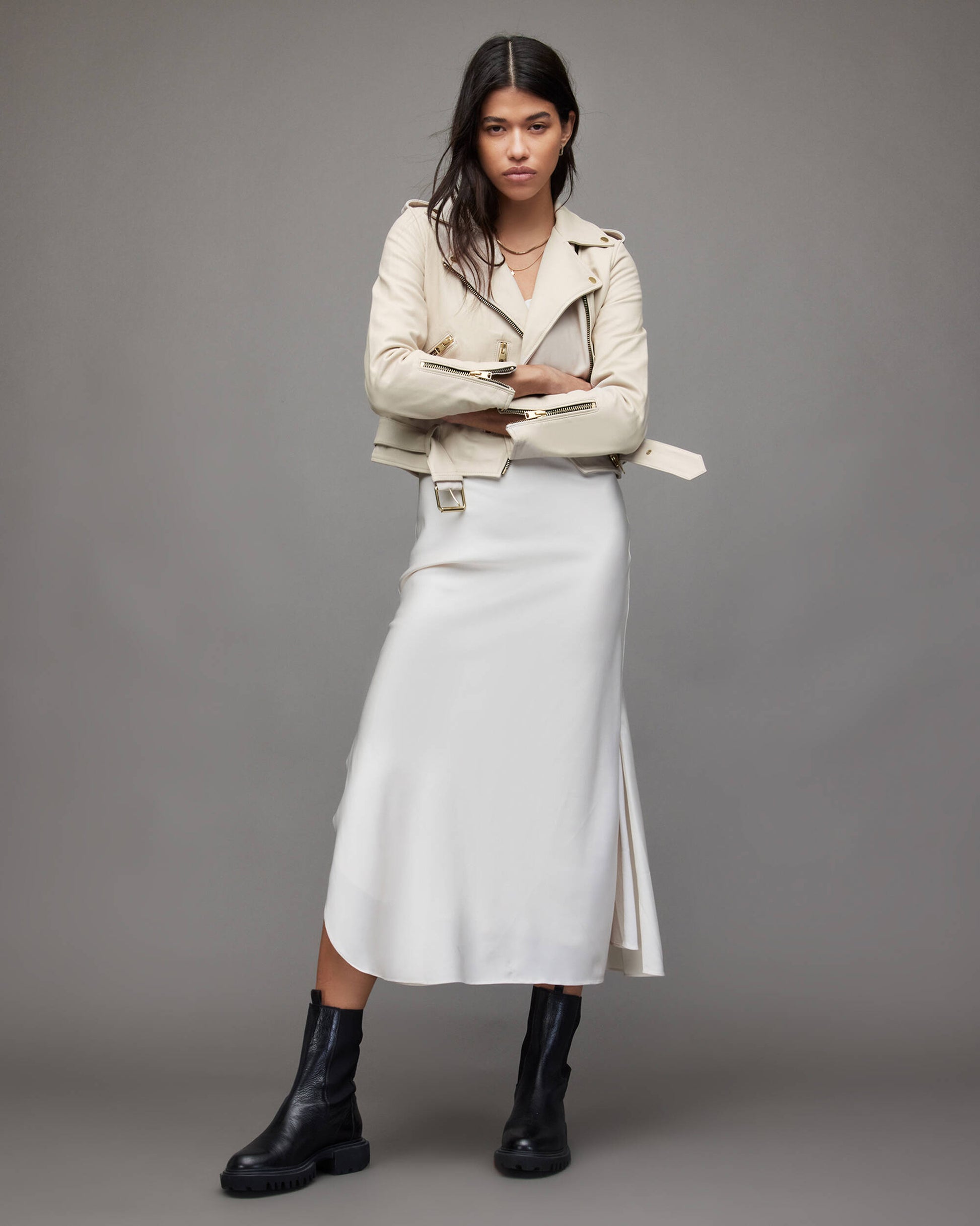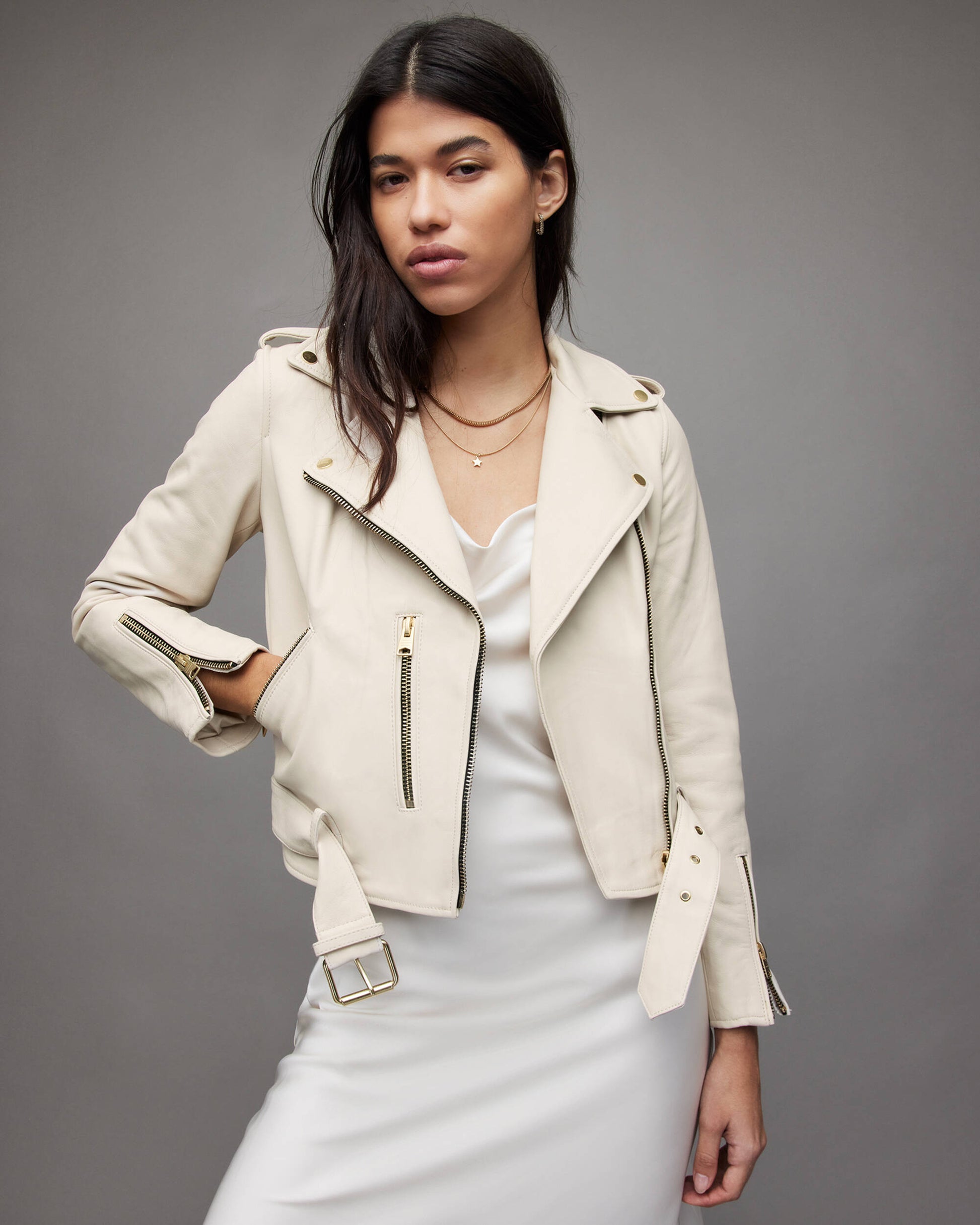 Women's Beige Leather Biker Jacket with Belt