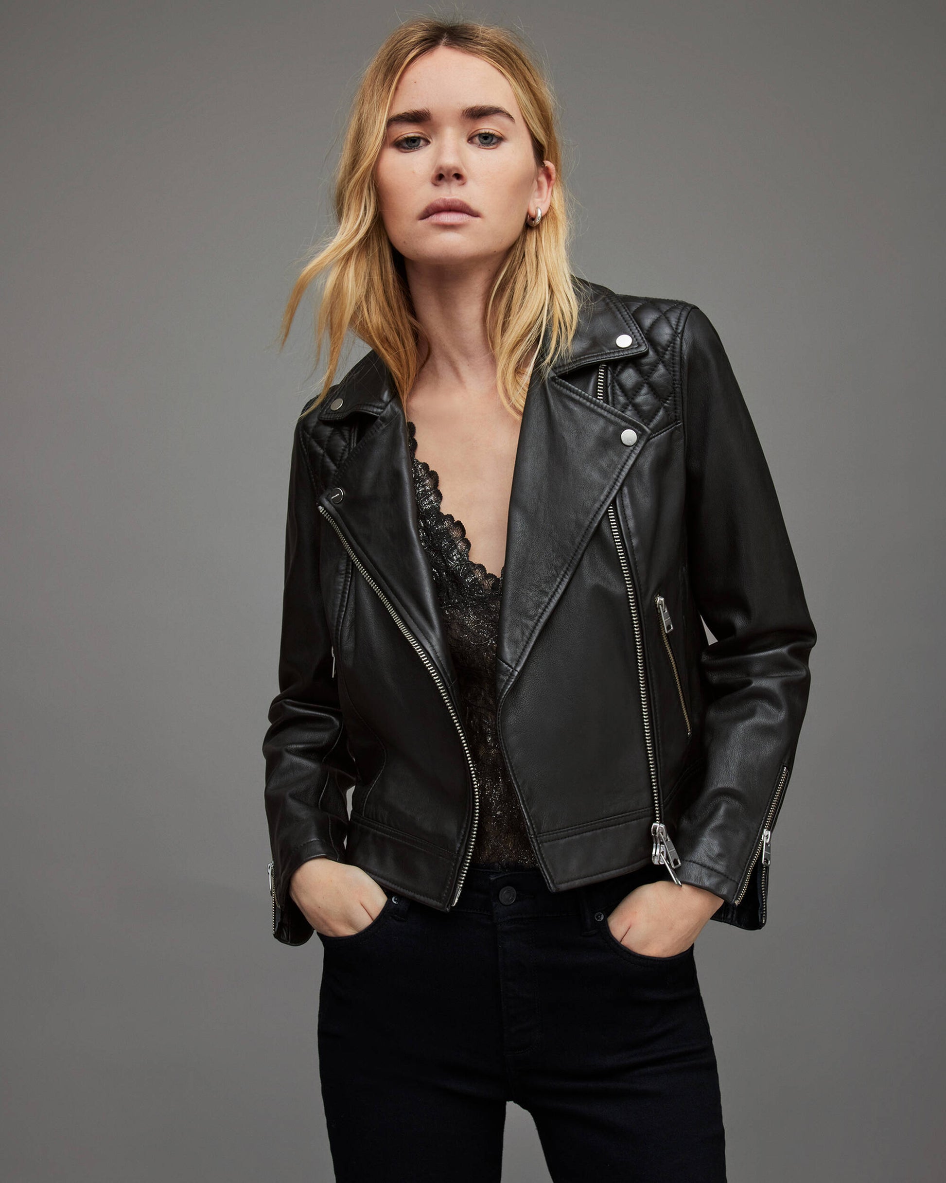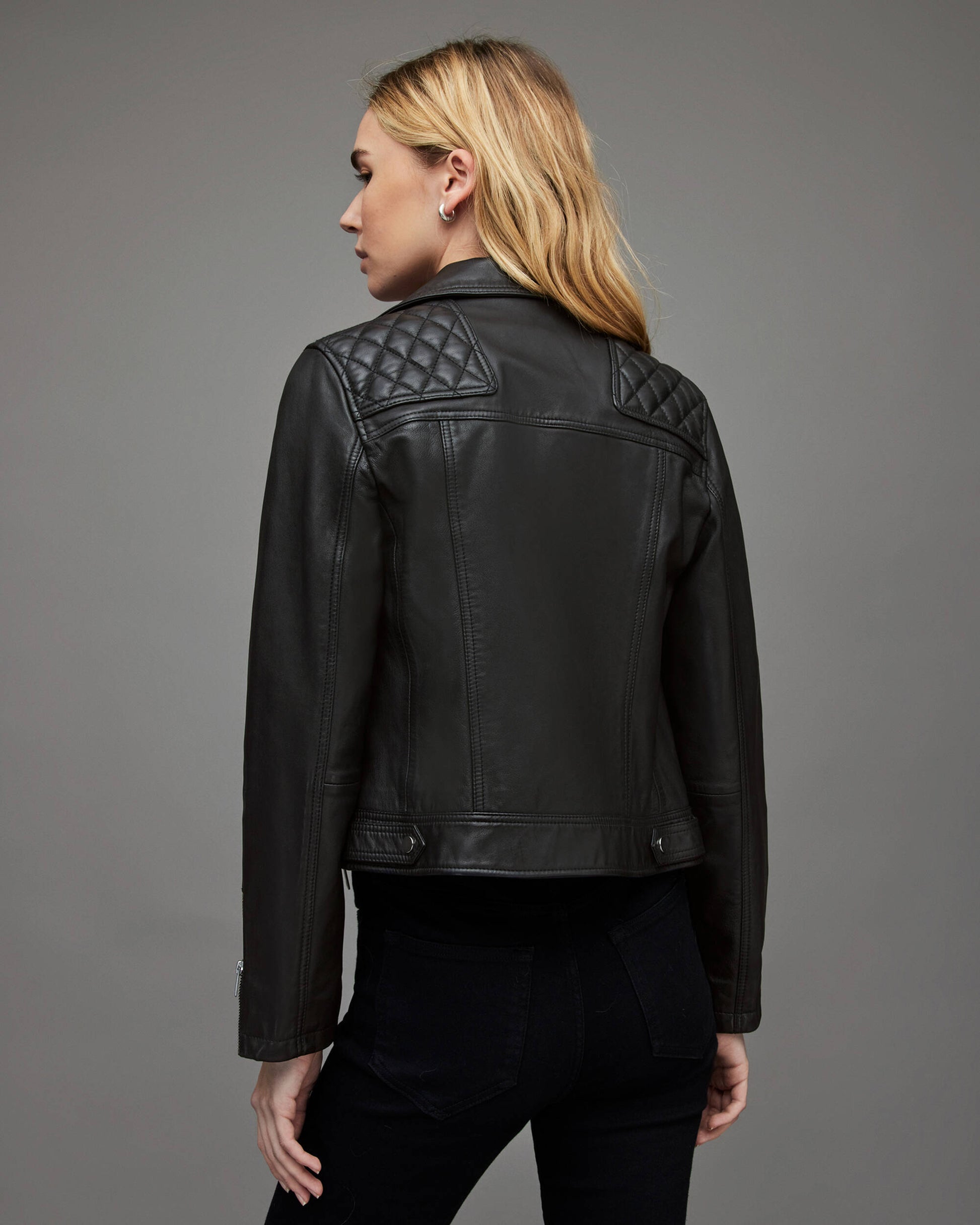 Women's Black Leather Biker Jacket with Quilted Shoulders