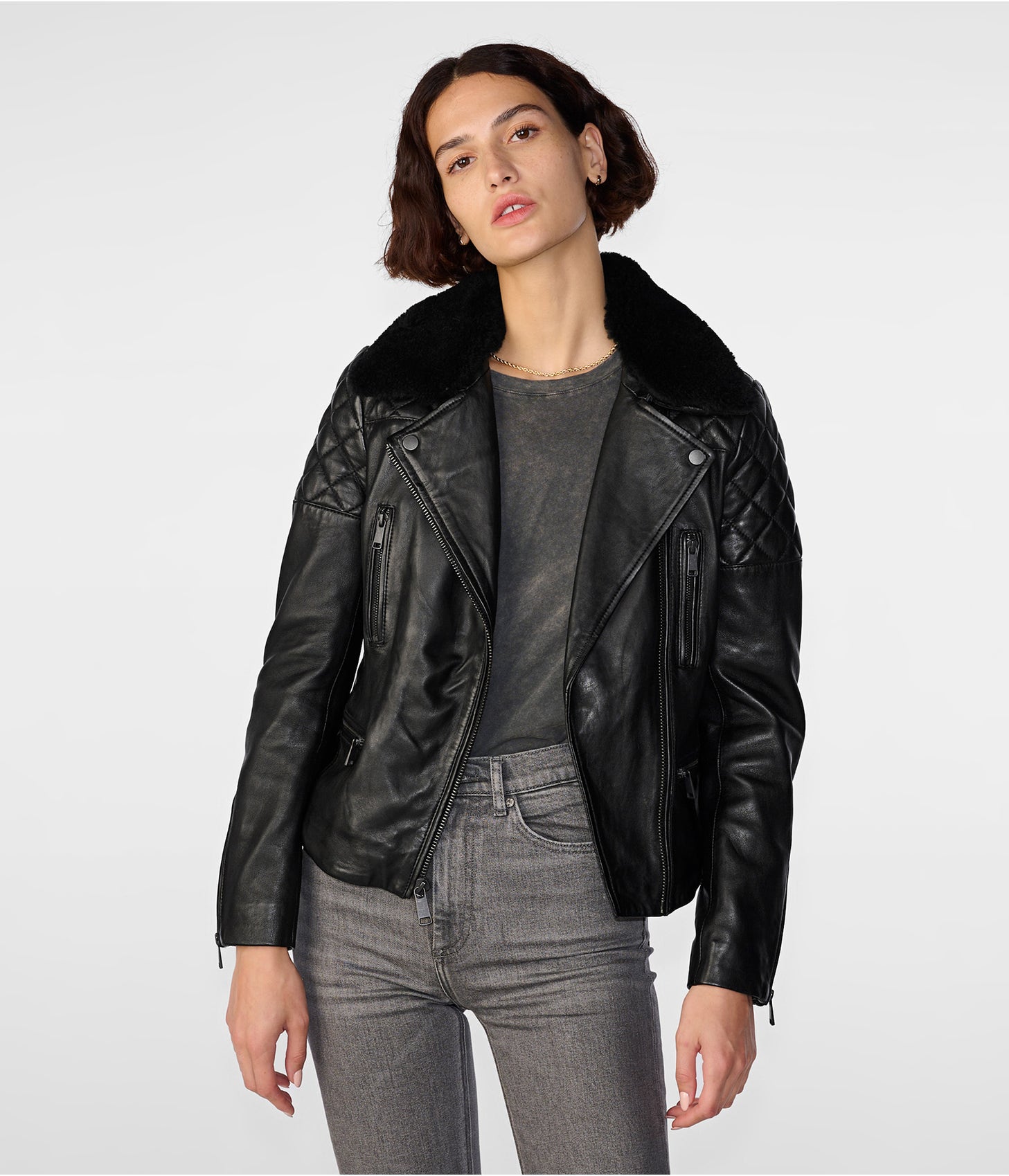 Elevate your style with the Women's Black Shearling Leather Biker Jacket from Avanzar Leather. This jacket features a sleek black leather exterior complemented by plush shearling lining, offering both sophistication and warmth. The classic biker design includes a secure zipper closure and functional pockets, while the shearling provides a luxurious, cozy touch. Ideal for adding a bold yet refined edge to your wardrobe, this jacket combines durability with timeless appeal. Enjoy hassle-free shipping, easy returns, and exceptional customer service with every purchase.