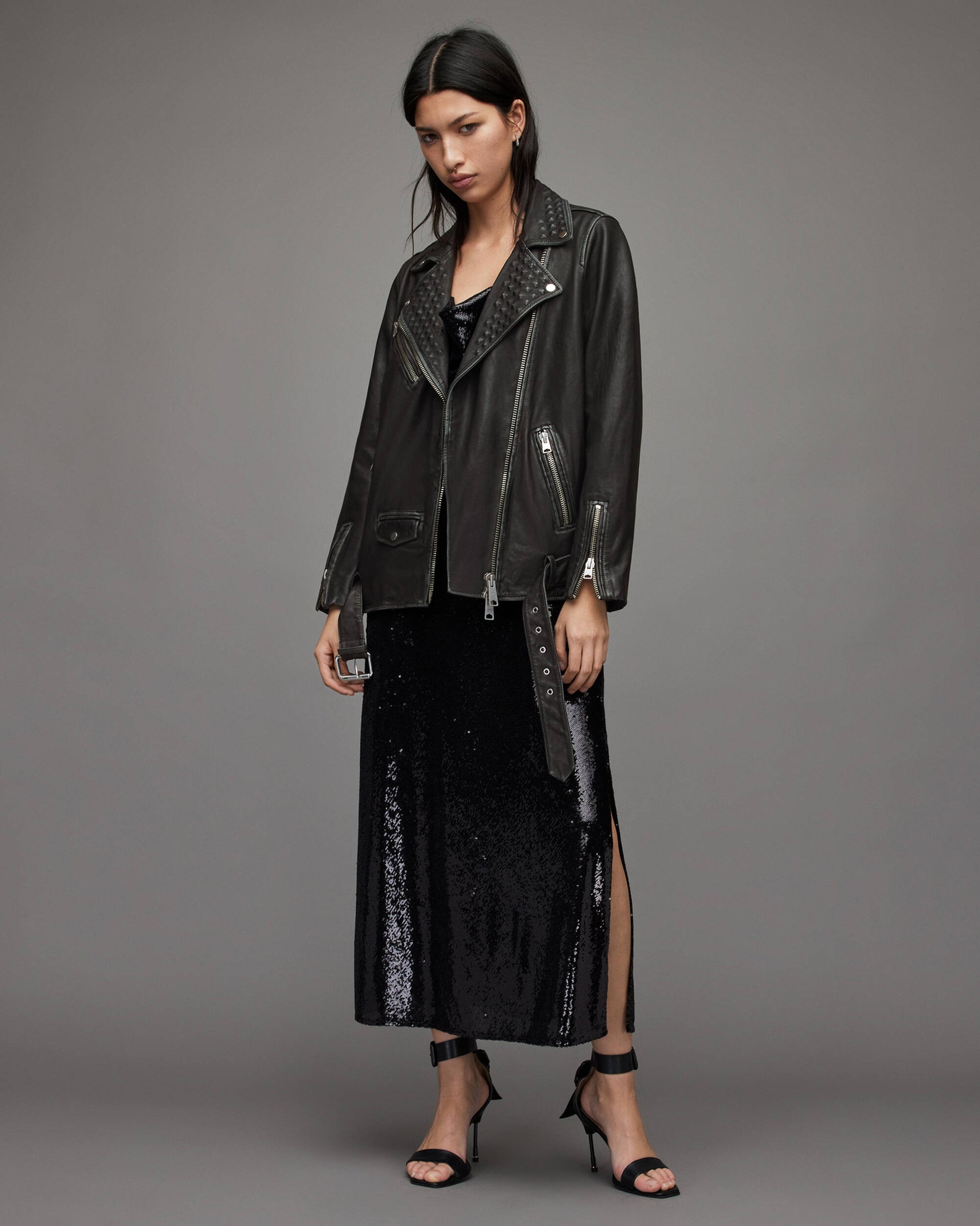 Unleash your bold style with the Women’s Studded Black Biker Leather Jacket With Belt. This statement biker jacket features high-quality black leather adorned with edgy studs, giving it a unique and rebellious flair. The included belt accentuates the waist for a flattering fit, while the classic biker design ensures timeless appeal. Perfect for making a daring fashion statement, this jacket offers durability and style. Shop at Avanzar Leather for exclusive deals, hassle-free shipping, and easy returns. Elevate your wardrobe with this standout piece.